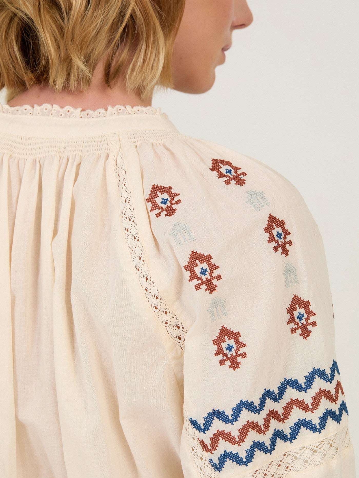 Blusa de algodão fino. Mangas compridas bufantes. Bordado étnico contrastante. Detalhes em renda.